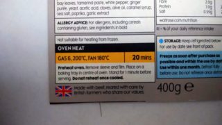 調理方法に書かれている、ガスマーク OVEN HEATのところに「GAS 6」「200℃」「FAN 180℃」と記載されている。 「200℃」は普通にオーブンで200℃。「FAN 180℃」はオーブンのFAN機能ONで...