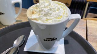 < 値段 >200° Coffee:£3.10 左:ラテ右:カプチーノコーヒーは苦め。悪くは無いが、そこまで美味しくもない。
