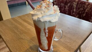 飲み物35点 イギリス【コスタ】 スティッキートフィーラテ Sticky Toffee Latte < 商品名 >Sticky:粘っこいToffee:飴Latte:ラテ < 値段 >Costa(コスタ):£4.40(Medium) < 感想 >イメージ画とだいぶ違う。上に乗ったクリーム的なものは???「スティ... 2024.01.14飲み物外食イギリス