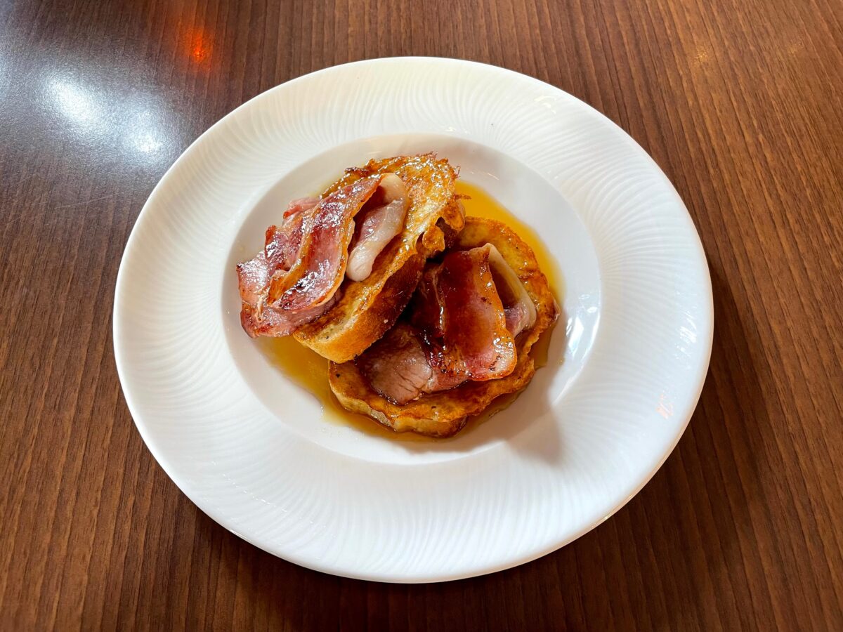 Italian bread dipped in egg and a touch of sugar, lightly fried and finished with bacon on top drizzled with syrup.