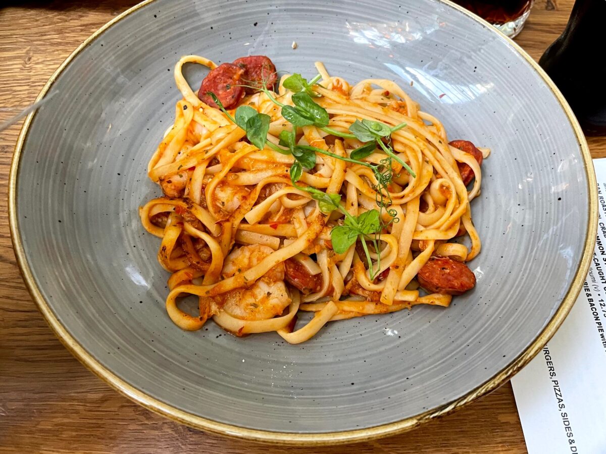King prawn, crab & chorizo linguine:エビとカニとチョリソのリングイネ