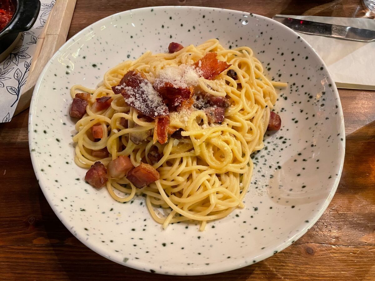 Spaghetti in a pecorino cheese sauce with crispy pancetta lardons