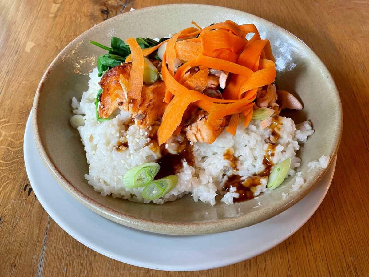 香ばしいジャスミンライスの上に、照り焼き風味のサーモンを炙り、ほうれん草、青ねぎ、ごま、にんじんのカールを添えています。