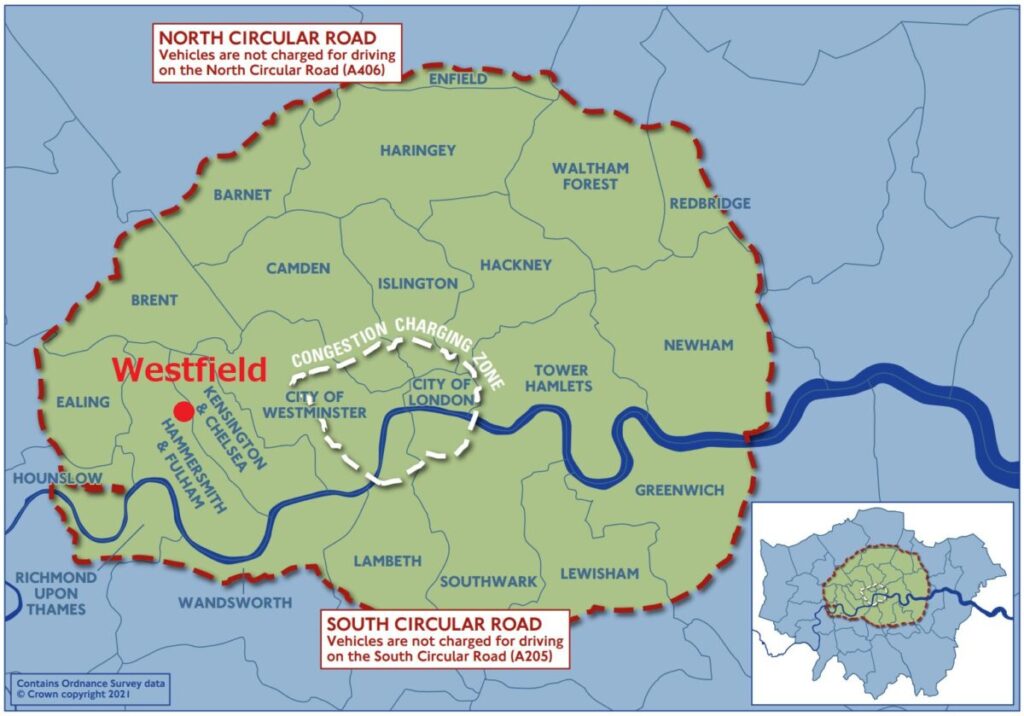 「ウェストフィールド・ロンドン」の位置は、地図に記した通りであり、白点線まではだいぶ余裕がある。
