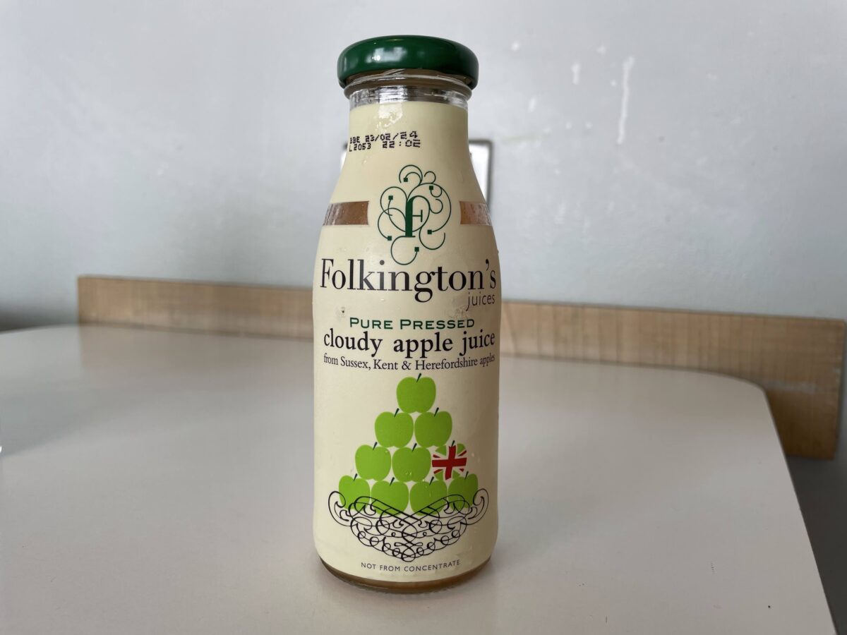 Folkington’s cloudy apple juice is made from blending the juice from two apple varieties: