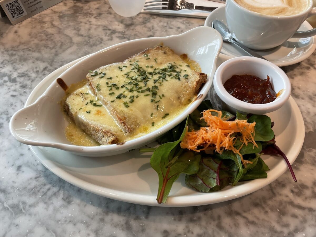 とろける熟成チェダーチーズ、チーズソース、ディジョンマスタードを手作りのグラナリーローフにのせ、サラダガーニッシュ、ハウスドレッシング、ハウストマトチャツネを添えた一品。