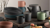 A similar effect can be seen on the bases of the Tsuma collection which are unglazed and smoky. The contemporary tea set is glazed with dark grey while the other box sets include four rich matte colours – Dark Grey, Green, Peacock Blue and Paprika.