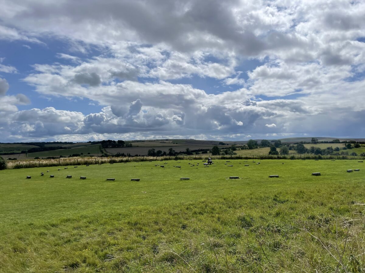 The Sanctuary lies at one end of the West Kennet Avenue, two parallel rows of standing stones that linked it to Avebury henge, 2.5 km away. The first three pairs of avenue stoneholes, leading towards the gate on the far side of this field, are marked by blue concrete blocks.