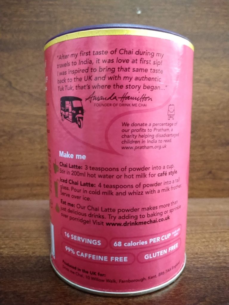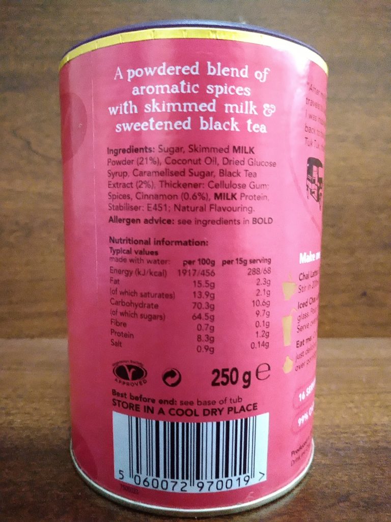 砂糖、脱脂粉乳(21%)、ココナッツオイル、乾燥グルコースシロップ、カラメル化糖、紅茶エキス(2%)、シナモン(0.6%) 牛乳たんぱく質