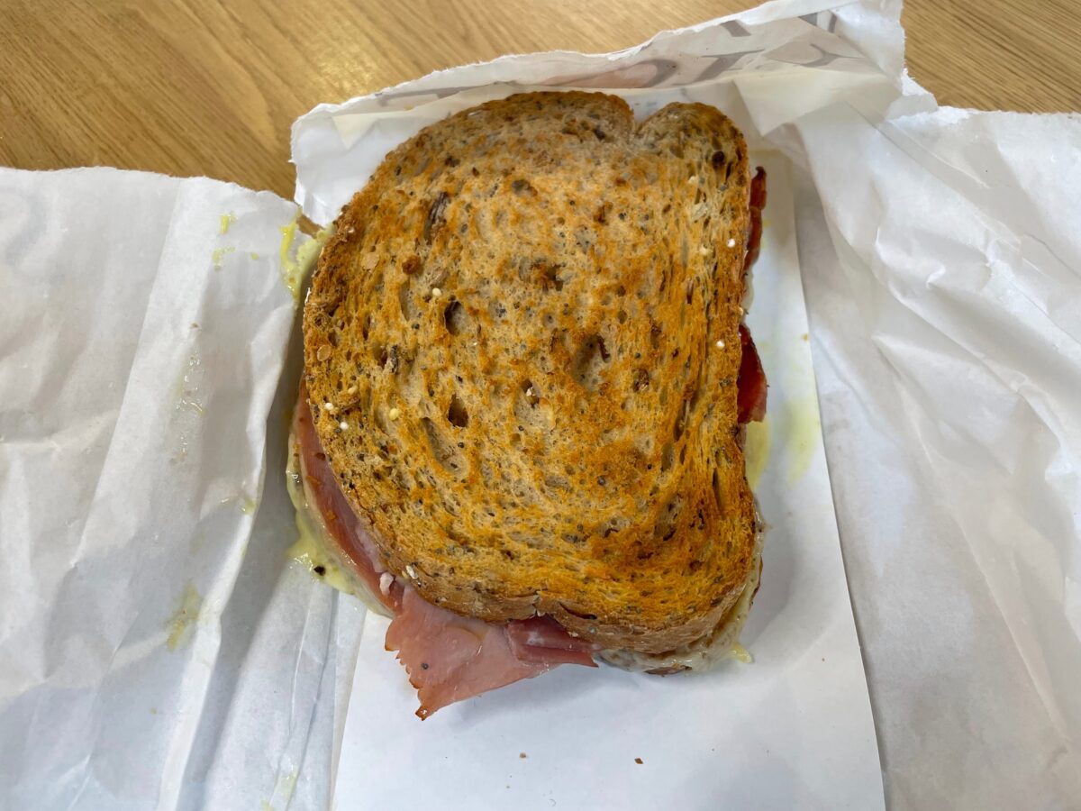 ウィルトシャーの生ハムと熟成チェダーチーズに、ピリッと辛いイングリッシュマスタードマヨと種入りのブルマーブレッドをたっぷりかけました。プレタの定番です。トーストしてお召し上がりください。
